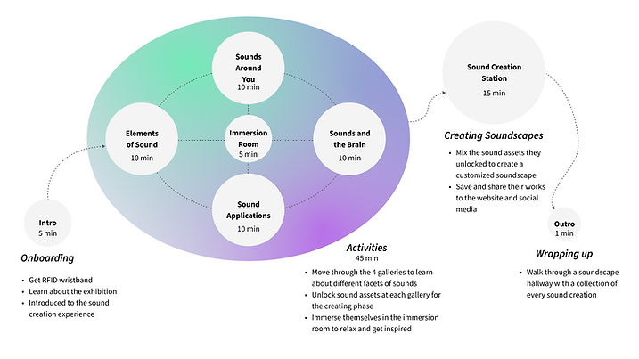 Our team had been fascinated by multisensory since the very beginning, and we had set creating a prototype that we could test with users under the 5-week timeframe as the ultimate goal. However, we initially focused on the multiple senses we use in our daily lives instead of focusing on sound. In that regard, we spent more than a week exploring different senses and their support theories in order to gather content for the exhibition. We realized that each sense was a pit that we might need tremendous efforts to research, which would wear out our time for design and prototyping. Given that one of the team members was a sound designer, we decided to pivot our direction to sonic experience and deep dive into it to prevent only having a superficial concept design for this project in the end.